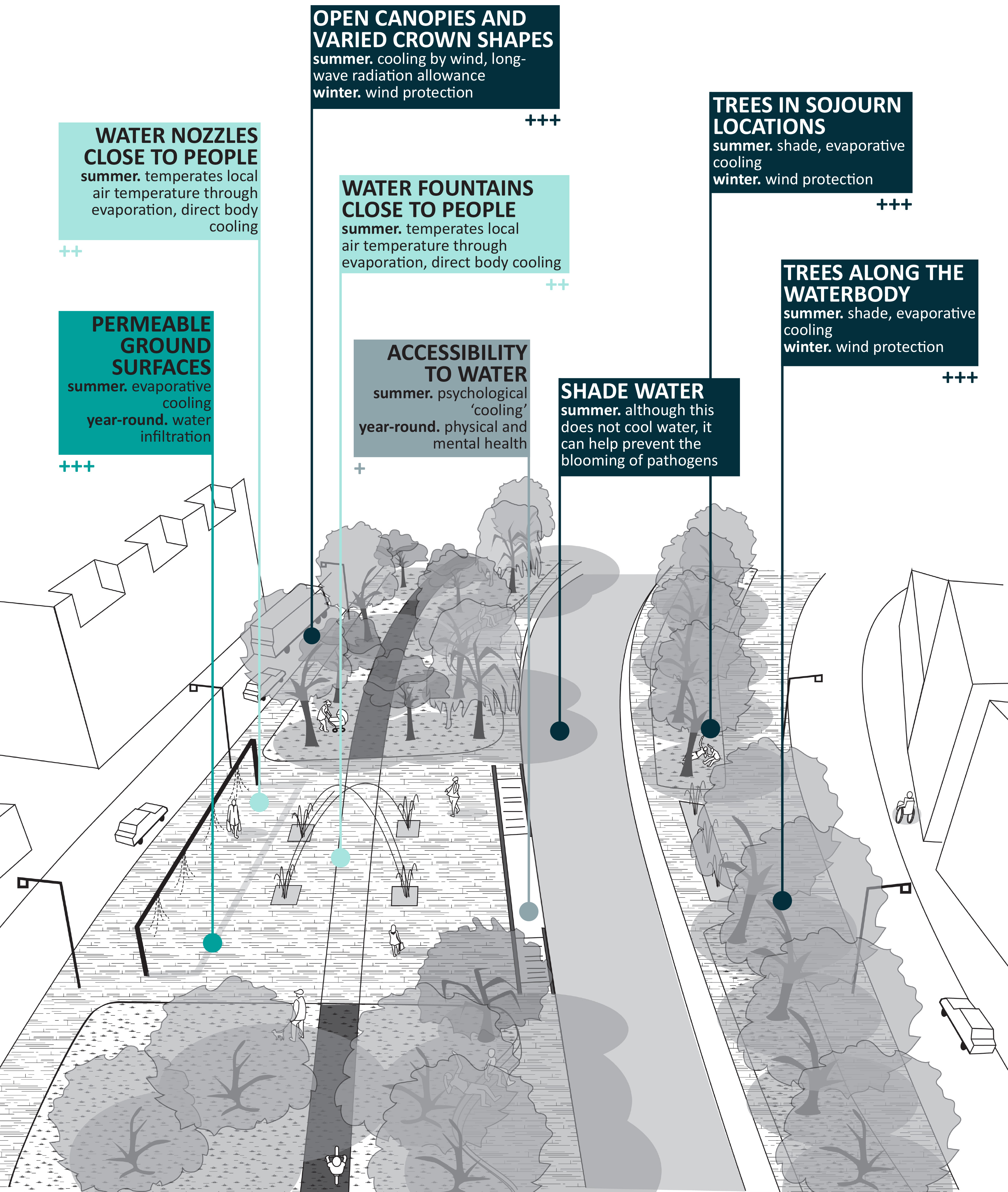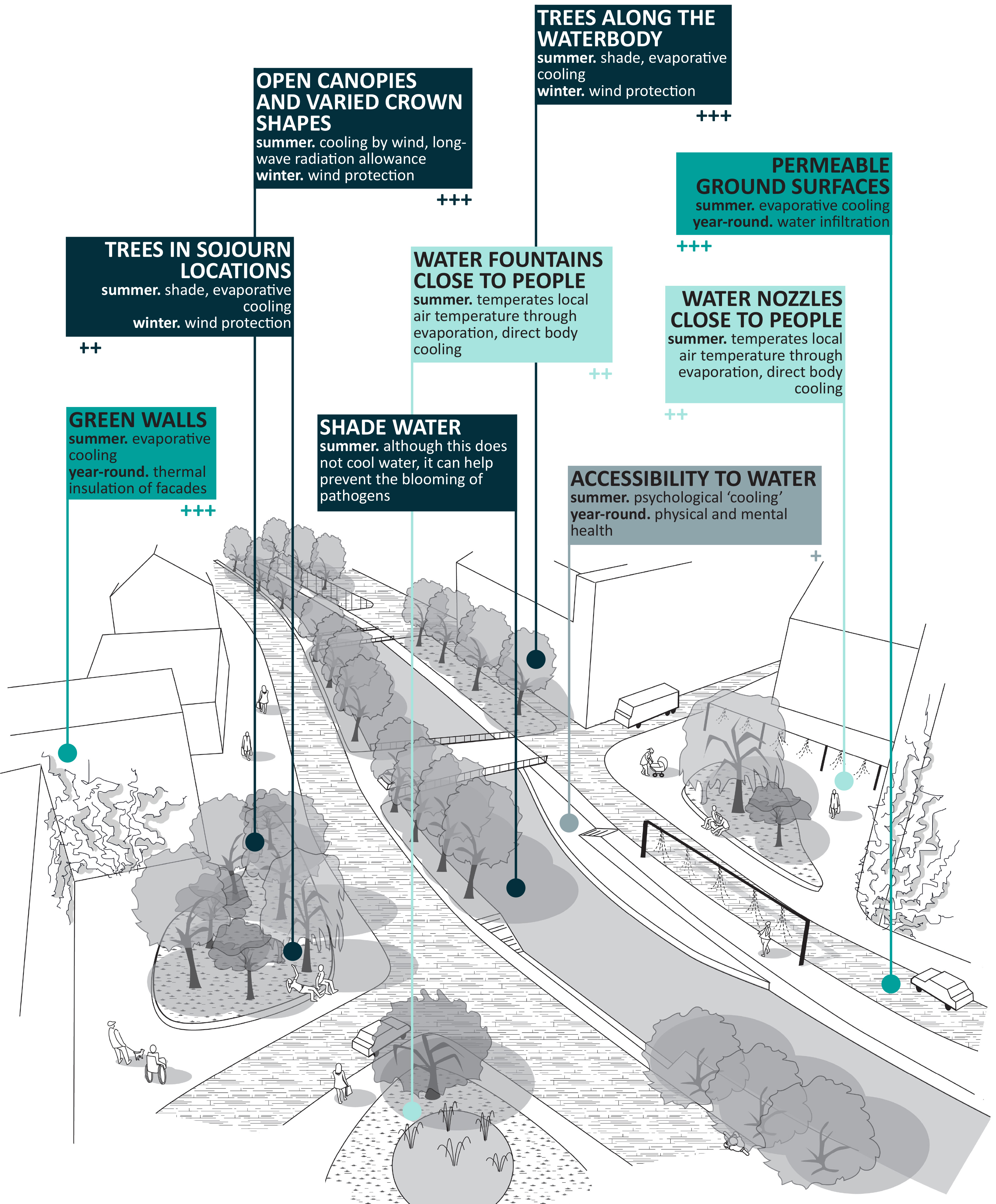 The role Wageningen University and Research plays in GreenQuays is that of contributing to the climate-responsiveness of the design proposal being developed by the design team of the municipality of Breda. The Landscape architecture (LAR) and the Meteorology and Air Quality Groups (MAQ) are collaborating with each other and with the other project partners in developing evidence on microclimatic aspects. The goal is to provide the design team with design principles targeted at achieving cooling effects. To this end, micrometeorological simulations and in situ measurements with meteorological stations are being undertaken by MAQ. Based on resulting data, LAR is developing the aimed climate-responsive design principles.